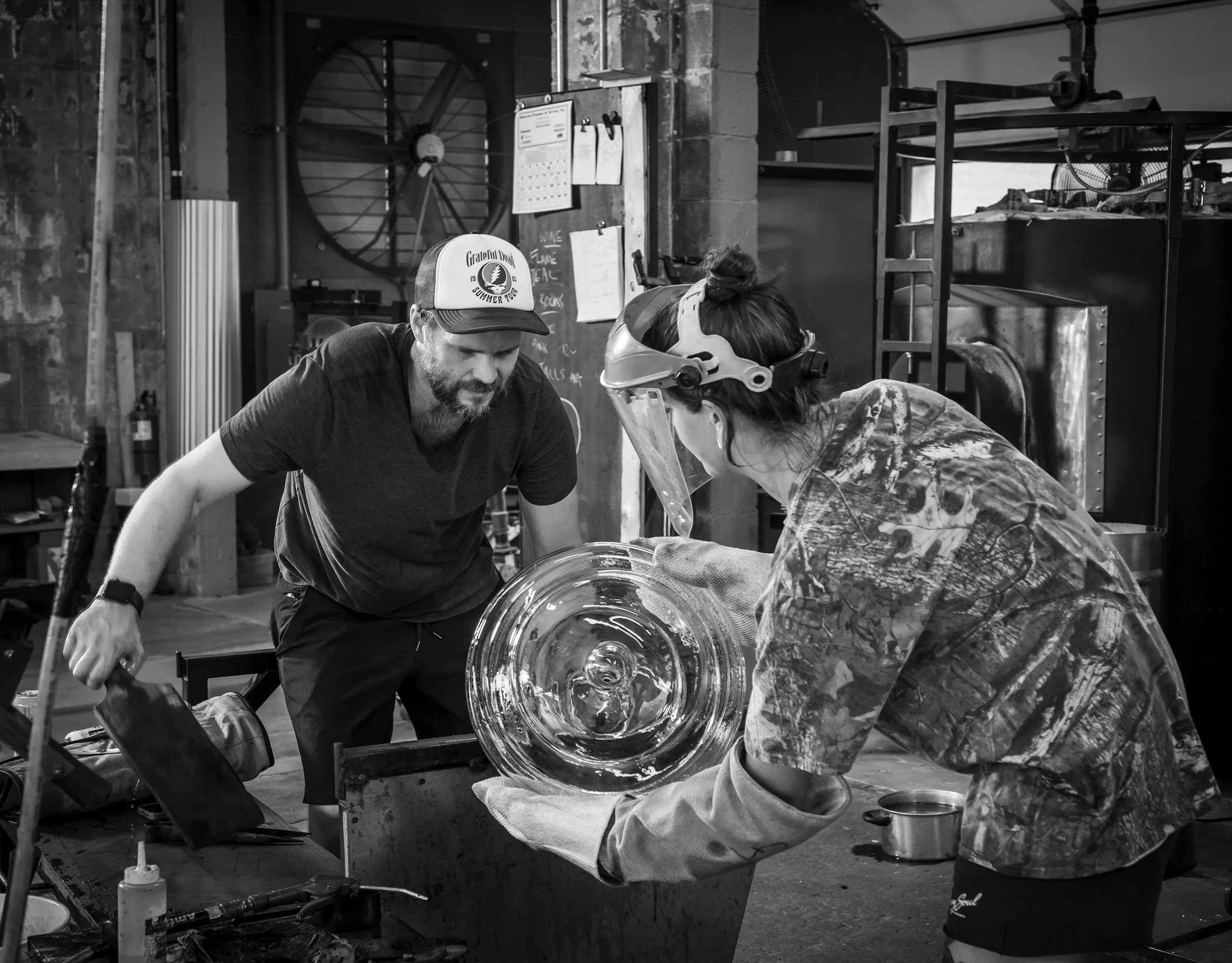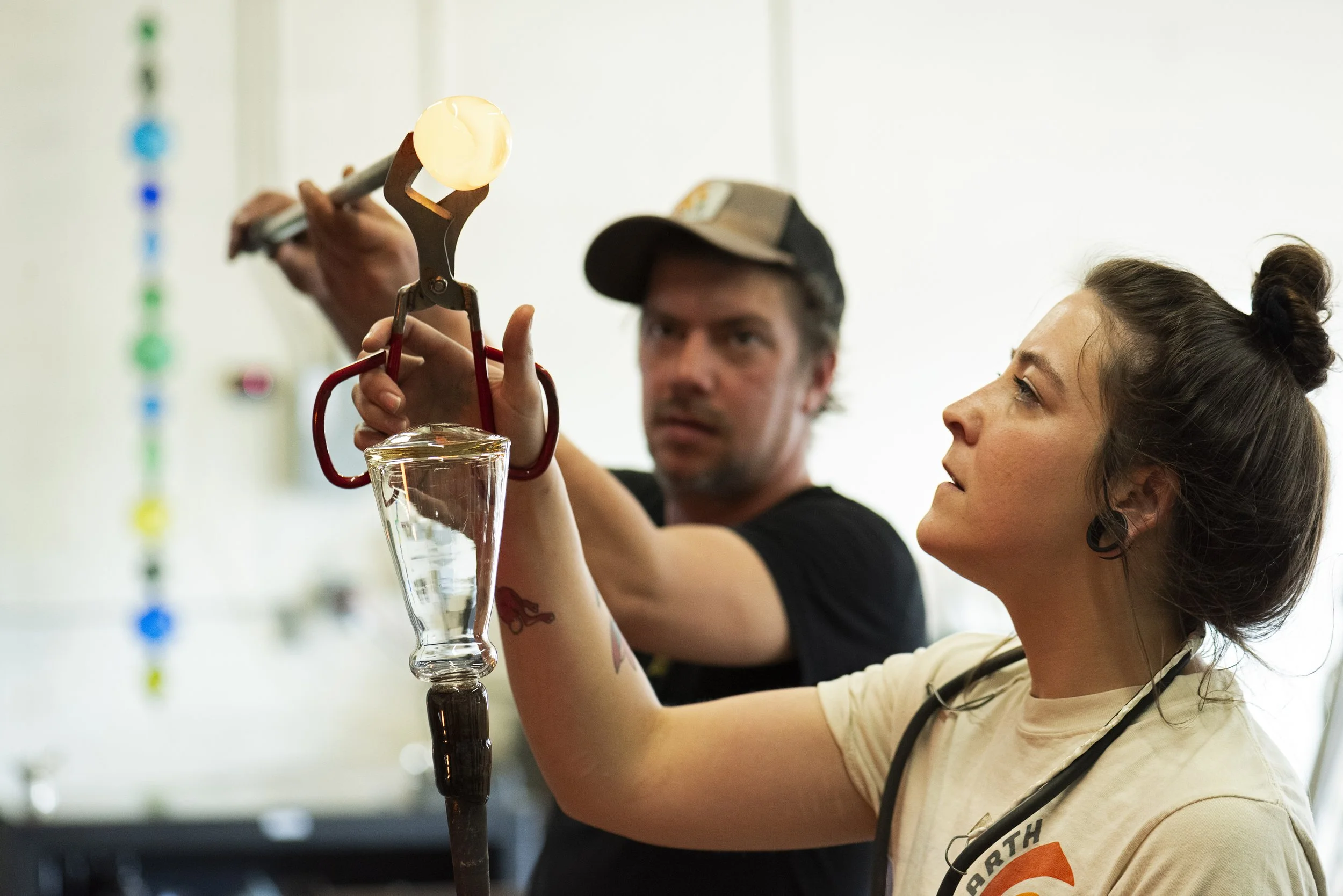 Head Gaffer, Katherine Zeilman, working on the Modern Snifter assisted by Tadayoshi Littleton (photo by LOAM Marketing)